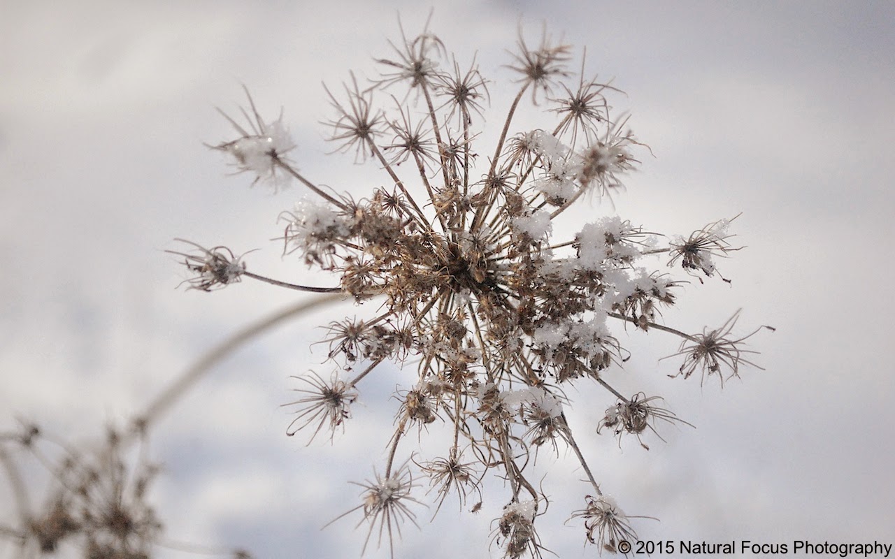 Queen Anne's Lace plant is pretty even in the winter time. The way the plant has spires during the winter is really cool. I picked this photo because I was practicing today on making the snow whiter than the grey result in other settings. A nice warmer sunny day to have a nature walk outside.